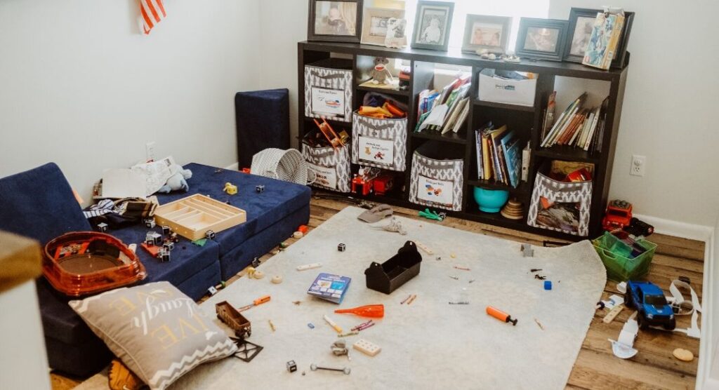 This is a real-life picture of my boys’ playroom. This destruction happened approximately 2.2 seconds after I helped them organize every last toy into their allotted bins on that bookshelf. Ok, maybe not 2.2 seconds but you get my drift. I have exhausted myself sounding like a broken record. “Pick up your toys, put them in their bins, no, not that bin, the cars and trucks bin!” to the point that I knew I needed a better system, and I needed the whole family to be on board with it.