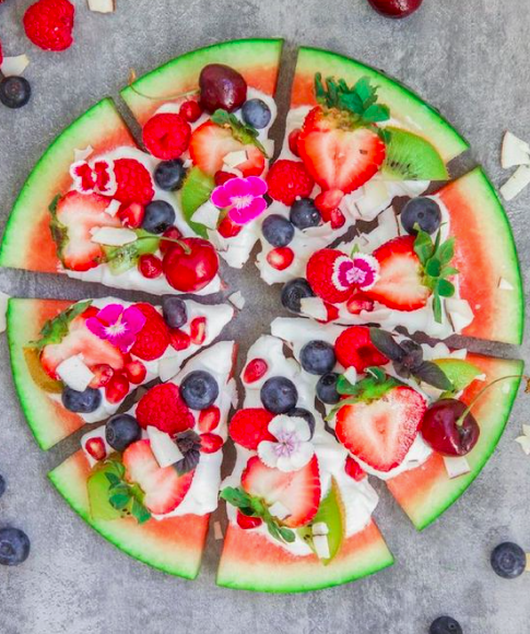 - Using a spatula, spread an even layer of your yogurt around the watermelon leaving a bit of empty space at the top. (where your “pizza crust” is.)